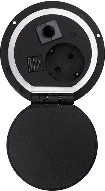 Блок розеток с беспроводной зарядкой имеет небольшие габариты - диаметр 80 мм, глубина 90 мм. Его можно встроить в столешницу, поверхность шкафа или тумбы. Он компактнее и универсальнее большинства аналогичных моделей, представленных на рынке. В закрытом состоянии фурнитура находится практически вровень с основанием, эстетично смотрится, не мешает и не отвлекает внимание.