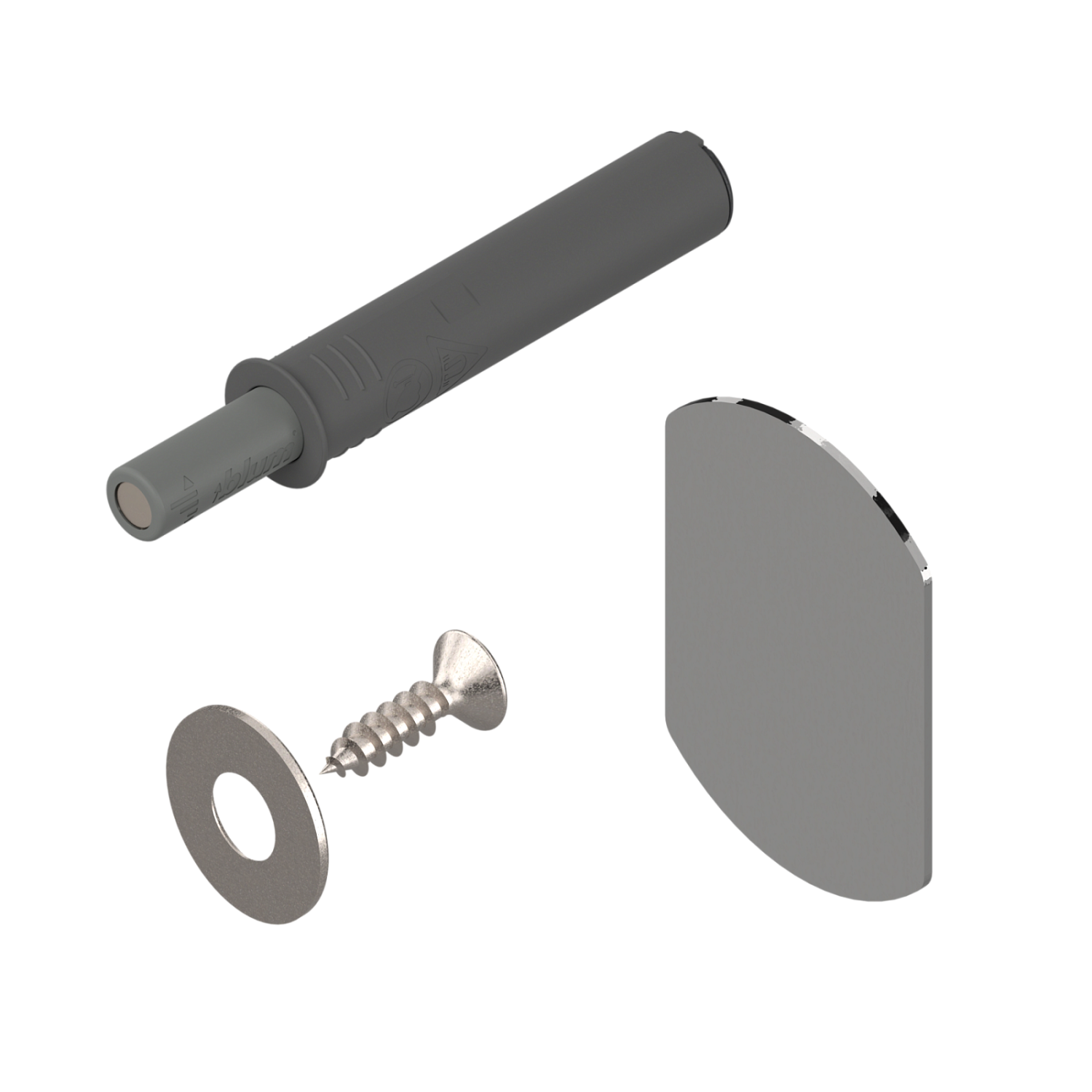 Комплект 956.1004 обеспечивает удобное открывание дверей лёгким нажатием. Короткая версия подходит для стандартных фасадов и обеспечивает стабильную работу механизма. Серый цвет делает комплект универсальным для большинства мебельных корпусов и остаётся малозаметным внутри шкафа.