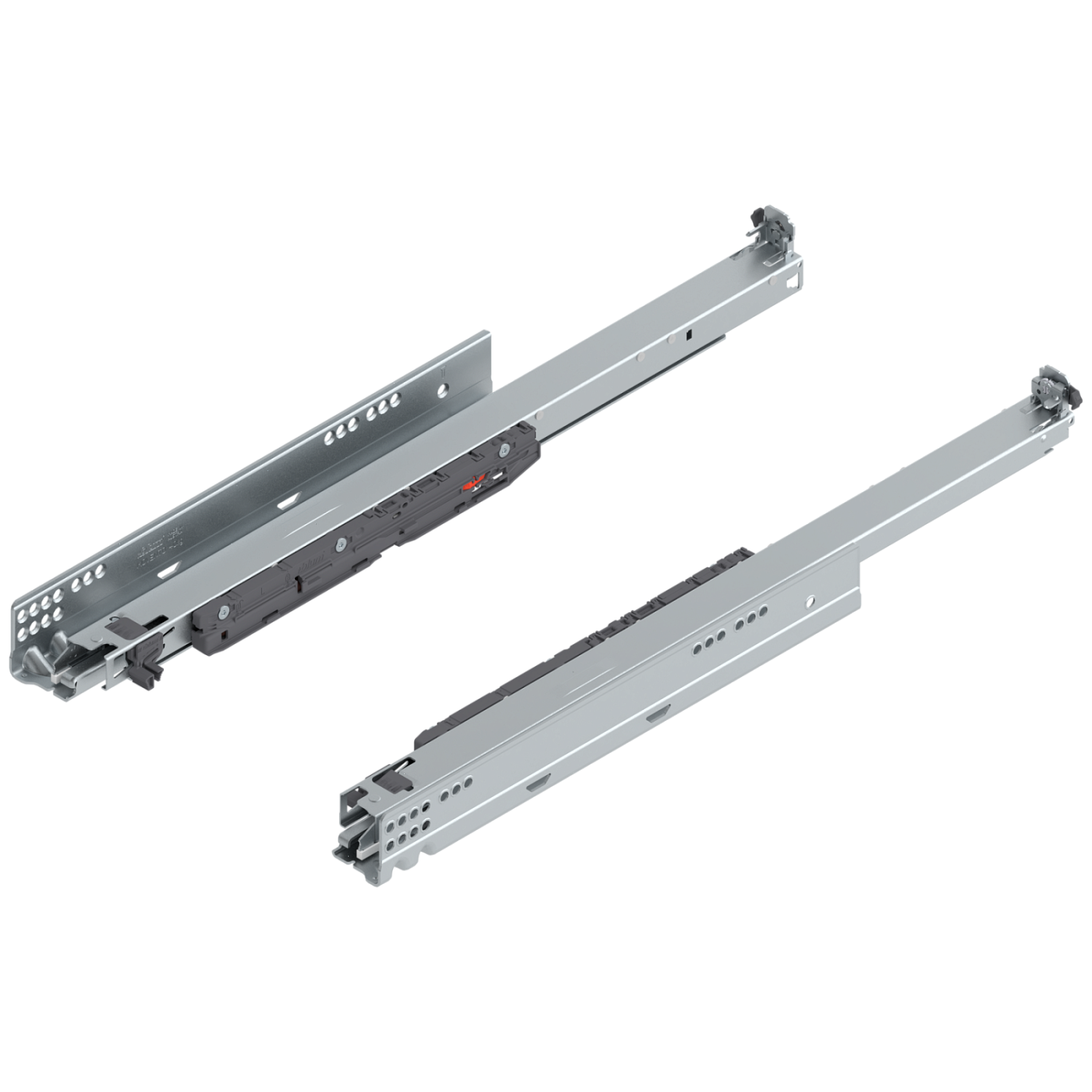 MOVENTO — флагманская система выдвижения Blum, отличающаяся высокой стабильностью, точностью хода и долговечностью. Благодаря синхронизированной системе валиков направляющие обеспечивают мягкое и ровное движение по всей длине выдвижения. Технология BLUMOTION S обеспечивает тихое и плавное закрывание, а также совместимость с системой TIP-ON BLUMOTION. Монтаж осуществляется под замки, позволяющие легко фиксировать и снимать ящик.