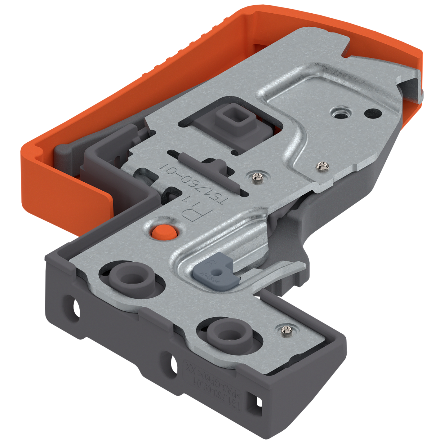 Замок работает в паре с левым T51.7601.L и является обязательным элементом при сборке выдвижных систем MOVENTO. Фирменный оранжевый цвет облегчает монтаж и визуальный контроль. Конструкция рассчитана на длительную эксплуатацию и высокие нагрузки, характерные для премиальных систем выдвижения.